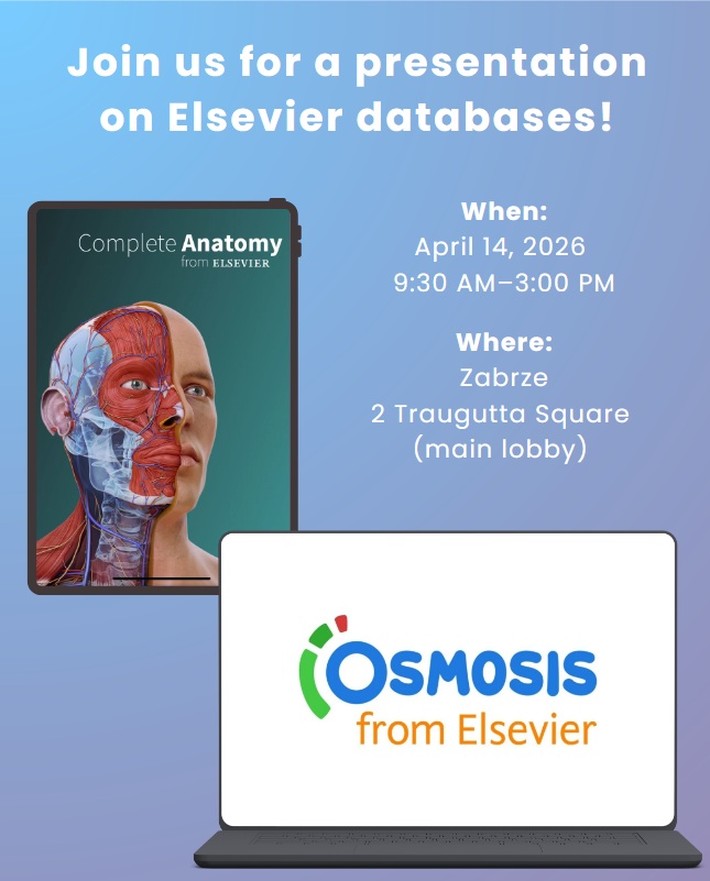 Join us for a presentation on Elsevier databases in Zabrze! On April 14, 2026 from 9:30 AM–3:00 PM in the Dean’s Office building main lobby (Zabrze, pl. Traugutta 2) we will be there for you.